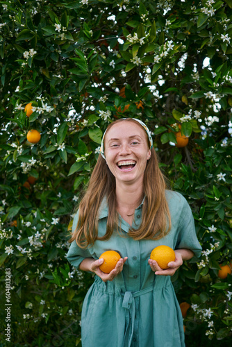 Happy woman with brown hair holding oranges in front of tree at orchard