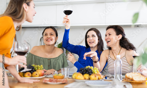 Happy women congregated around a festive table; participating in animated discussions and enjoying the delights of red wine