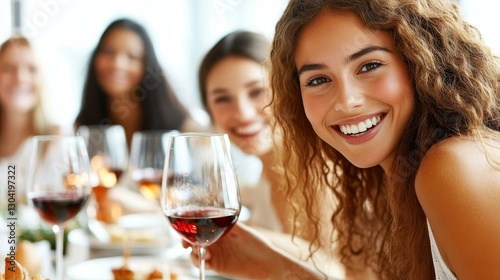 woman, dinner, wine, friends, celebration, happy, caucasian, 4, eatery, goggles, table, enjoy, conversation, meal, friendship, wine glass, food, people, smiling, party, celebrate, social, gathering