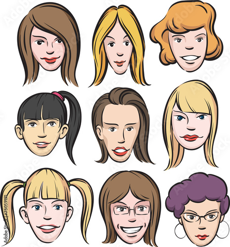 people, woman, face, set, icon, isolated, girl, person, team, humor, head, cartoon, caricature, character, hair, feminine, beauty, ponytail, pigtail, earring, lipstick, fashion, style, vector, illustration, female, smile, look, line art, drawing, adult, blond