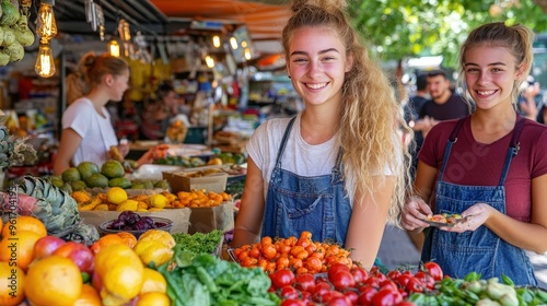 Happy Women Working at Farmers Market Selling Fresh Produce
