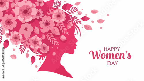 celebration, flower, floral, silhouette, woman, feminine, pink, illustration, graphic, art, design, symbol, beauty, growth, spring, decorative, hair, leaf, nature, concept, happy, greeting, card, poster, background, creative, modern, vector, digital, style, artistic, elegant, female, empowerment, joy, holiday, event