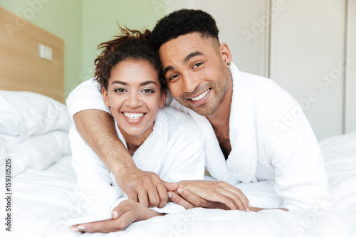 Happy young african loving couple on bed