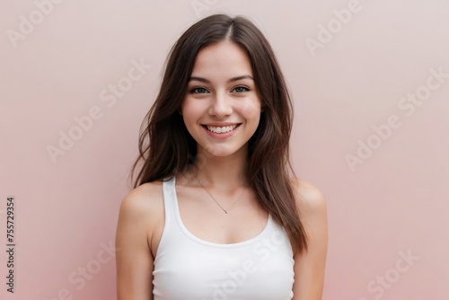 copy space, cropped, tank top, white, shirt, cheerful, missy, teenage, smiling, looking, teenage girl, american, pretty, youthful, energetic, pink, cosmetic, skincare, product, advertisement, woman, beauty, smile, model, face, hair, brunette, fashion, person, 1, studio, teenage, lady, happiness, closeup, eye, dress, fresh, expression, freedom, student, playful, lovely