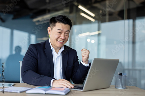 Happy young Asian male businessman sitting in the office at the work desk and being happy, looking at the laptop screen and showing a victory yes gesture with his hand