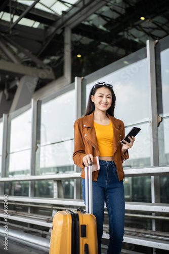 Happy young asian woman traveler using smartphone and holding boarding pass while standing at the airport terminal ready for vacation trip, smiling female tourist with confidently travel insurance