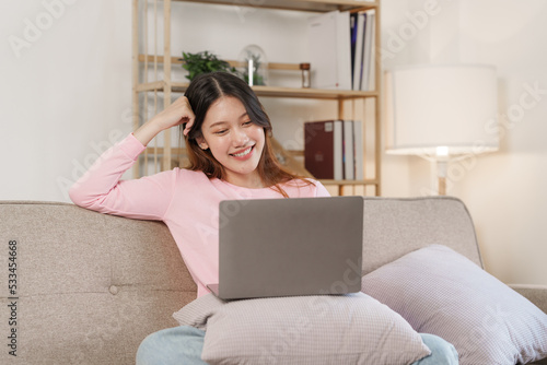 Happy young attractive smiling asian woman enjoying relax time at apartment.