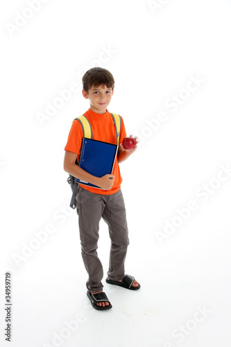 boy, male, white, background, caucasian, smile, happy, standing, tween, young, school, notebook, backpack, apple