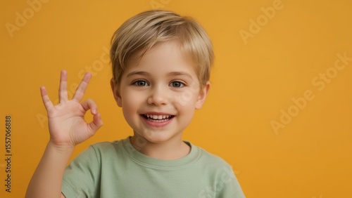 Happy young boy with blonde hair makes an "OK" hand gesture with a big smile, yellow backdrop.