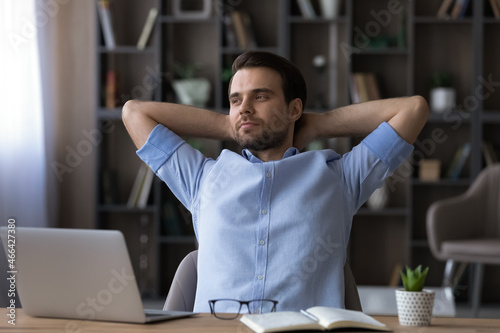 Happy young businessman relaxing with folded hands behind head, enjoying break pause carefree peaceful time sitting at table with computer in modern home office, visualizing future, meditating indoors