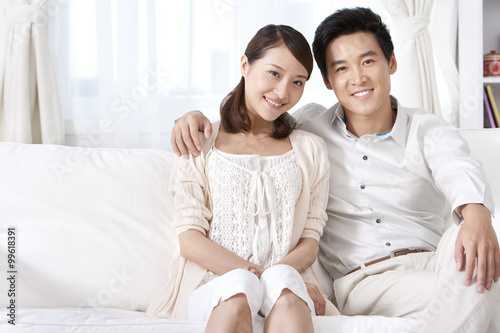 young couple, chinese, bonding, love, living room, sofa, affectionate, comfortable, happiness, couple, lifestyle, togetherness, close to, home interior, white, people, two people, woman, female, missy, man, male, young men, asian ethnicity, young adult, boyfriend, girlfriend, husband, wife, carefree, cheerful, enjoyment, joy, satisfaction, relaxation, loving, care, side by side, sitting, smiling, toothy smile, casual clothes, button down shirt, blouse, furniture, curtain, bookshelf, copy space, front view, photo, color image, horizontal, china, east asia, asia, beijing, indoor, day, sunlight