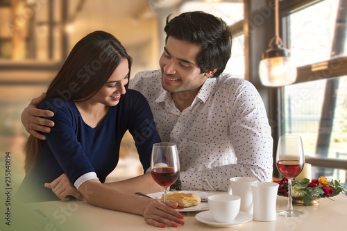 adult, adults only, affectionate, bonding, breakfast, casual clothes, cheerful, coffee cup, day, domestic life, drinking, dating, eating, food and drink, embracing, healthy lifestyle, holding, indoor, lifestyle, man, morning, people, relaxation, sitting, smiling, table, togetherness, two people, woman, young adult, young couple, young men, missy, cafes, eatery, wine glass, red wine, horizontal, february 14, indian, asian, asian ethnicity