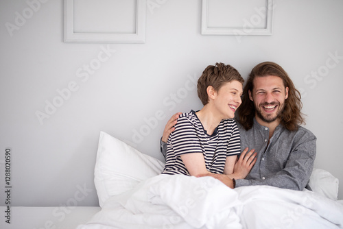 happy, young, couple, bed, home, happiness, fun, laughing, smiling, copy space, people, adult, woman, man, female, male, cuddling, sitting, embracing, joy, cheerful, enjoying, love, leisure, cosy, lifestyle, modern, affection, bonding, bedchamber, affectionate, convenience, human relationships, comfortable, togetherness, pajama, mid, caucasian, relaxation, emotion, room