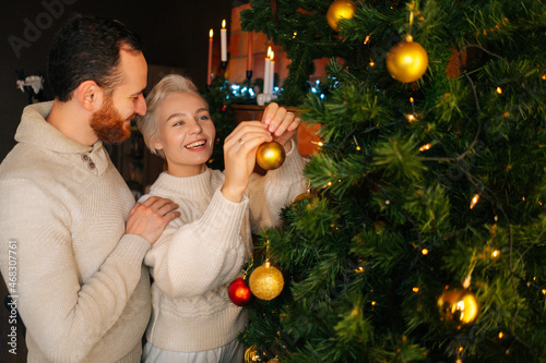 Happy young couple in love decorating Christmas tree with colorful shiny balls near fireplace in cozy dark living room. Cheerful man and woman preparing home for New Year holidays celebration