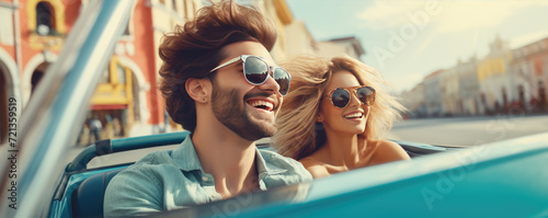 Happy young couple is enjoying ride in a cabriolet car during summer sunny day, active lifestyle concept