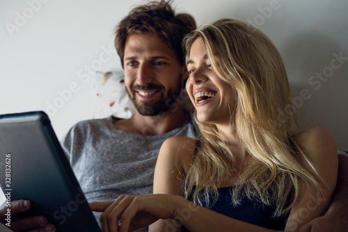 man, woman, looking, pointing, sitting, laughing, cheerful, happiness, love, bedchamber, bed, pillow, togetherness, bonding, leisure, lifestyle, relaxation, connection, communication, technology, wireless, blond, beard, t-shirt, two people, young, adult, male, female, indoor, day, photo, horizontal, front view, head shot, color image