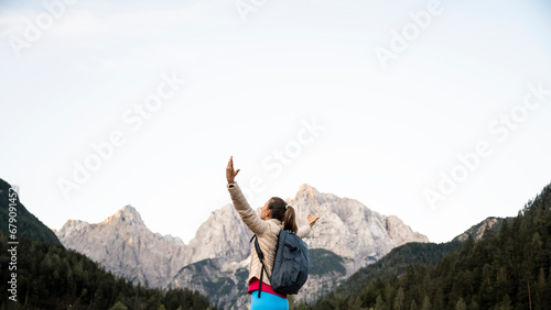 Happy young female hiker standing surrounded by beautiful high mountains with her arms spread wide