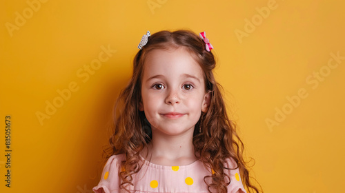 Happy Young Girl with Colorful Hair Clips in Playful Pink Dress Against Bright Yellow Backdrop