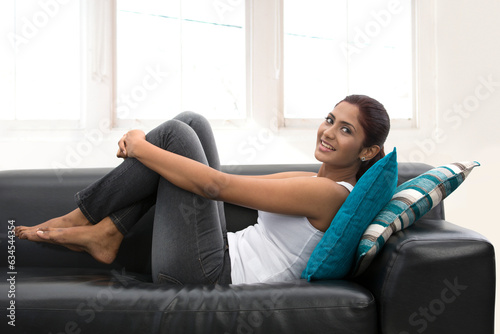 Happy young Indian woman relaxing at home on the sofa.