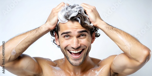 happy, young, man, pleasant, massaging, scalp, shampoo, hair, white, background, generative, ai, wellness, relaxation, personal, care, hygiene, cleanliness, grooming, hair care, pampering, soothing, calming, rejuvenating, refreshing, invigorating, calmness, serenity, peaceful, gentle, soft, tender, relaxed, calm, serene, content, joyful, delighted, thrilled, ecstatic, satisfied, pleasure, enjoyment, comfort