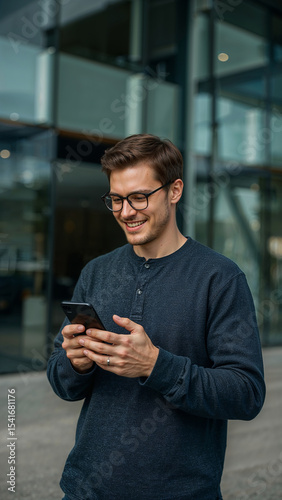 man, young, adult, smiling, happy, cheerful, mobile phone, smartphone, mobile phone, device, technology, using, looking, reading, text message, communication, connection, networking, online, cyberspace, app, glass building, architecture, urban, exterior, outdoors, eyeglass, goggles, casual clothes, sweater, modern, lifestyle, business, city, portrait, attractive, photogenic, positive, content, digital, contraption, front view, daylight