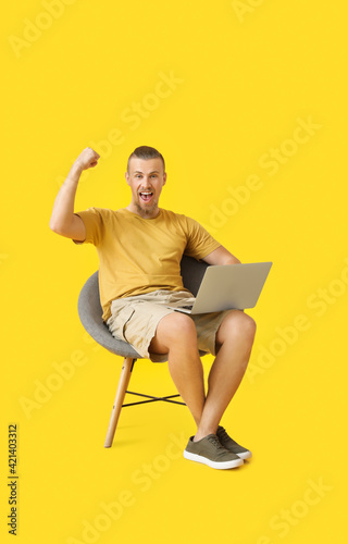 Happy young man with laptop sitting in armchair on color background
