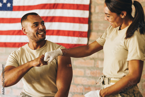 vaccination, army, pandemic, flu, american, protection, medicine, medic, virus, female, male, booster, woman, military, armed forces, america, medicals, us, congratulating, people, immunisation, vaccine, doctor, soldier, man, smiling, shot, prevention, health care, flag, health, epidemic, us, nurse, happy, injection, bandage