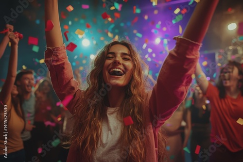 Happy young woman celebrating at a vibrant party with colorful confetti at night in an energetic venue