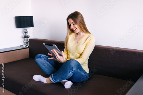 Happy young woman enjoying games on her tablet and relaxes with