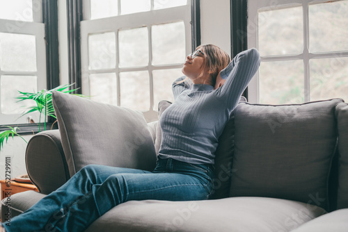Happy young woman in eyeglasses relaxing on sofa with hands behind head in the living room of her house. Carefree and satisfied lady with relaxing on couch at modern apartment.