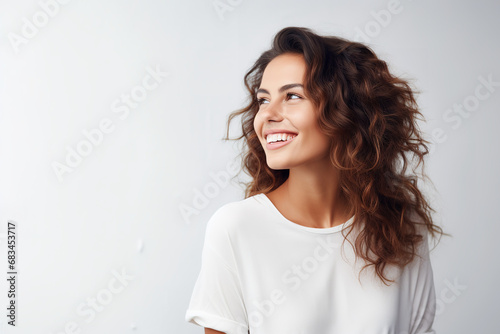 Happy young woman looking away with a smile while standing in a studio background