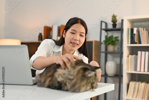 Happy young woman playing her fluffy gray cat lying on desk at home office. Love, friendship and pets concept
