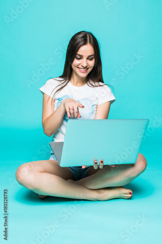 Happy young woman sitting on the floor with crossed legs and using laptop on color background