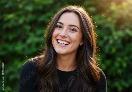 woman, happy, smile, portrait, young, female, face, girl, cheerful, joy, attractive, brunette, hair, outdoors, nature, summer, lifestyle, pretty, caucasian, teeth, dental, positive, background, green, park, spring, cute, friendly, lady, carefree, sunlight, sun, backlit, skin, skincare, model, laughing, fresh, casual attire, lovely, garden, healthy, people, 1