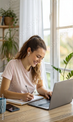 Happy young woman using a laptop at her desk, taking notes while attending an online webinar or virtual meeting from home. (People)