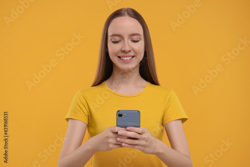 Happy young woman using smartphone on yellow background