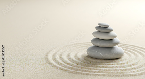 Harmoniously stacked grey stones on meticulously raked sand, symbolizing balance, tranquility, and inner peace in a minimalist, serene composition, perfect for mindful reflection.