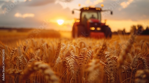 Harvest scene with ripe wheat and a tractor under a sunset sky, epitomizing rural life and agriculture, Concept of harvest, farming, and rural beauty.