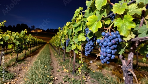 Harvesting grapes at night in a vineyard scenic landscape nature peaceful atmosphere