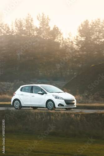 driving, car, vehicle, countryside, hatchback, road, compact, rural, travel, modern, outdoors, transportation, speed, motion, scenic, nature, automobile, street, highway, journey, road trip, asphalt, open road, traveling