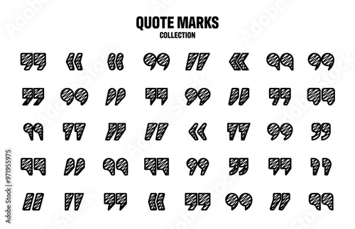 Hatched text quotation marks. Hand drawn quotes icon. Typographic speech mark symbol. Vector illustration. Message or comment. Vector illustration