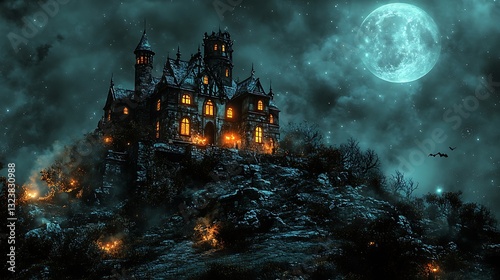 castle, haunted, skittish, halloween, night, moon, full, hill, dark, mysterious, gothic, scarey, horror, fantasy, eerie, ominous, creepy, silhouette, landscape, scene, illustration, digital, art, painting, artwork, background, texture, october, bat, fright, fear, thriller