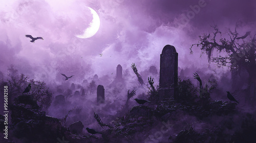 Haunted Graveyard Scene with Eerie Fog and Dark Tombstones at Midnight