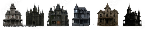 Haunted mansion set including Victorian, gothic, abandoned, and dilapidated styles isolated. Halloween and horror building collection.