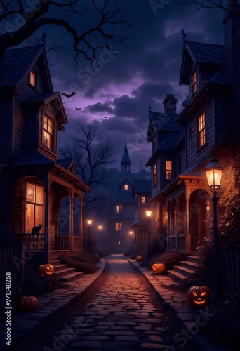 Haunted Village Street at Dusk – Halloween Illustration