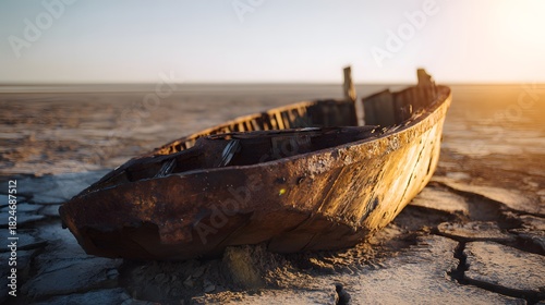 Haunting shipwreck rests on a desolate shore bathed in golden sunlight evoking history and timeless beauty