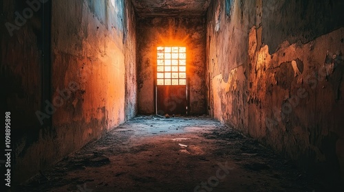 Hauntingly abandoned industrial corridor with cracked walls and a mysterious glowing doorway at the end, casting an eerie light on the dark surroundings
