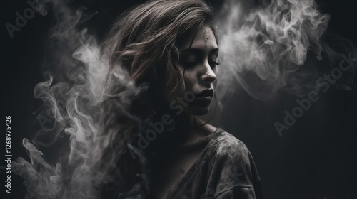 Hauntingly beautiful portrait of a faceless figure enveloped in ethereal smoke and monochrome tones
