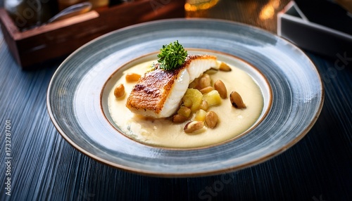 Haute Cuisine Cod Dish On Restaurant Table White Fish As Cod Perch Codfish In Cream Sauce Garnished With Pine Nuts Delicious Creamy Seafood Codfish Dish In Restaurant Style Plating