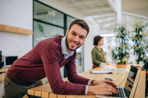 business, people, person, happy, corporate, cheerful, occupation, office, adult, work, job, professional, co-worker, joyful, satisfaction, successful, technology, smile, young, colleague, employee, workplace, satisfied, digital, smiling, table, attractive, elegant, confident, motivated, entrepreneur, looking, hand, interior, caucasian, connected, businessman, man, male, photogenic, standing, laptop, computer, bearded, typing, project, idea, design, plan